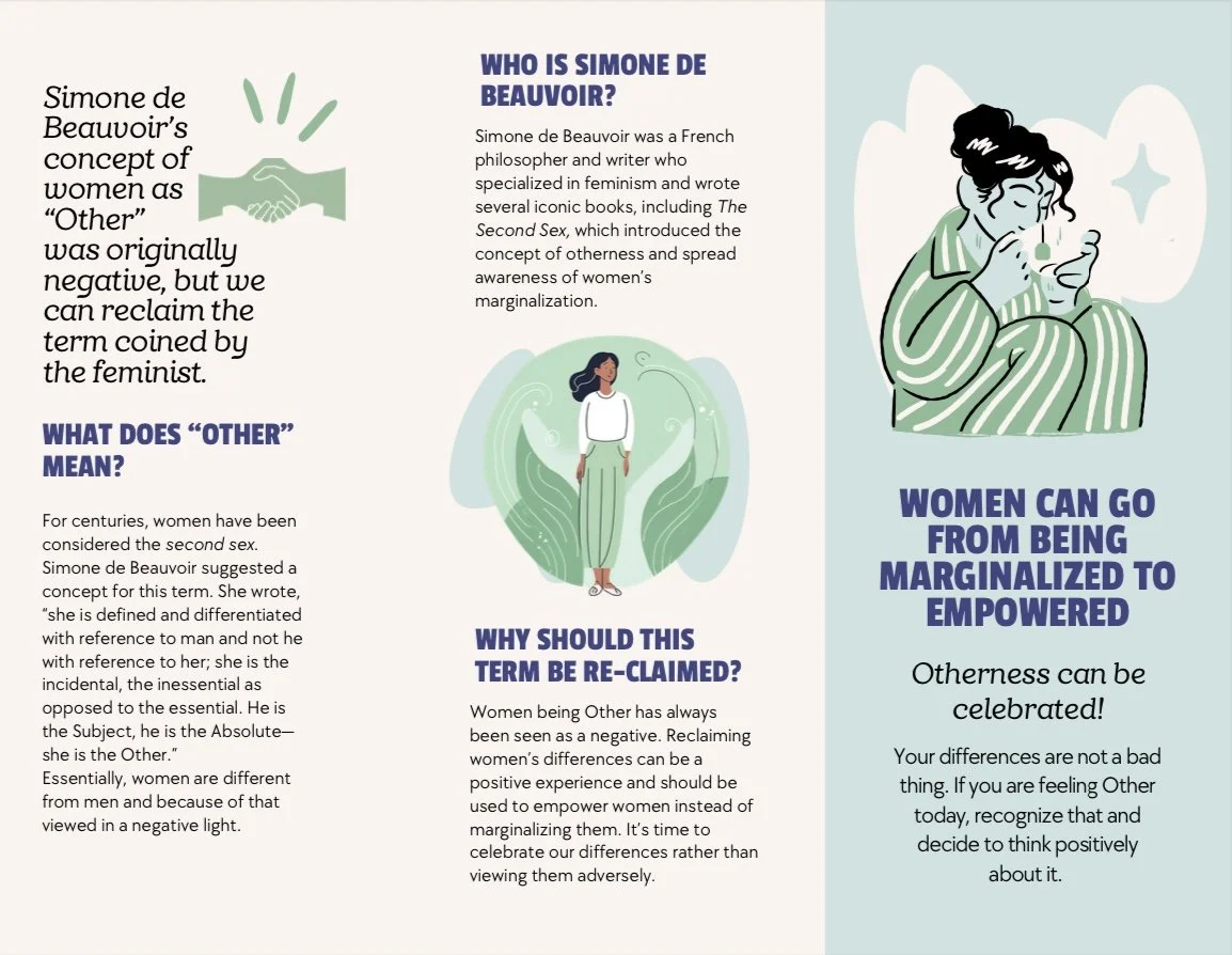 I created this artifact in the Fall of 2024 in Dr. Sladky’s Introduction to Rhetoric and Composition course, ENGL 3050. The original assignment was our final multimodal project that required us to come up with a presentation on a topic or concept of our choice and incorporate multimodal elements in it. My project was an expository brochure, mainly for women, on Simone de Beauvoir’s concept of “other.” I chose to include this artifact in my portfolio because it was a creative project that I really enjoyed making and researching for, and it reflects a part of rhetoric’s history that has always fascinated me. The brochure is strong in its pleasing aesthetic and digestible information, but if I were to revise it, I would break up some of the text blocks on a couple of pages and create more blank space so it is less intimidating.